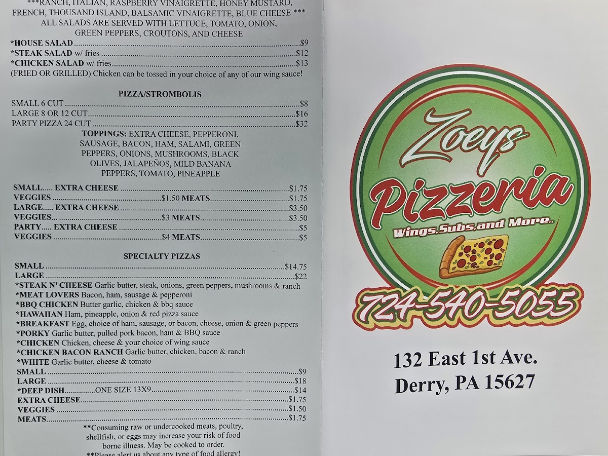 Welcome to Zoeys Pizzeria, a cozy Italian eatery located in the heart of Derry, PA. Indulge in delicious pizzas and more at this local favorite.